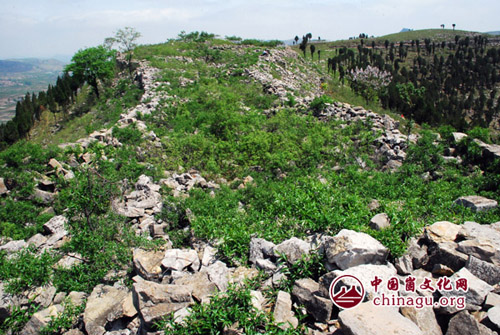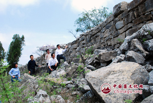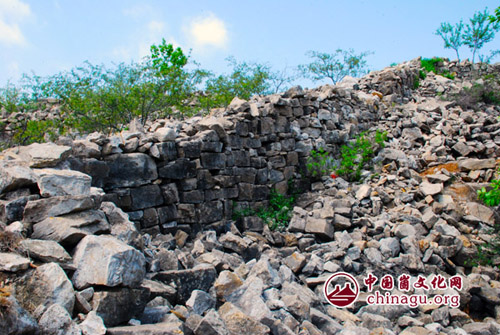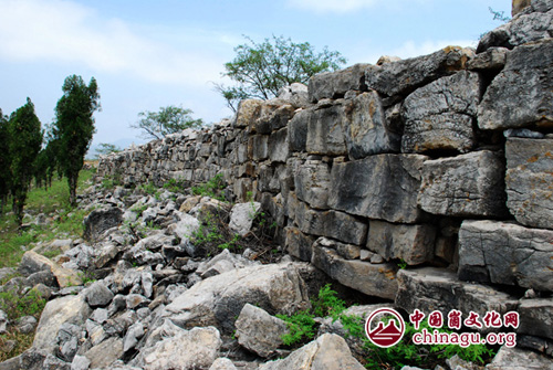 围墙在山顶呈扁圆型,东西长,南北窄,最窄的地方也就10余米的样子,它墙基很宽,顺着山头蜿蜒起伏,墙体虽不完整,但没有间断,高的地方能有两米多,周长足有7、8里之遥。我们对着围墙上垒砌规整的一米多长的条石,不由感叹:在那没有机械的落后年代,先人使用什么方法完成的呢?他们为此付出了多大代价啊!
