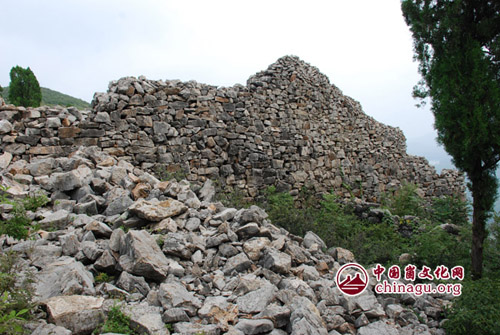 荷叶崮南北雄列三顶,山石修葺的寨墙,随着地势蜿蜒曲折,环绕崮顶。从崮下向上仰望,高高的崖壁之上,若隐若现的寨墙合围崮顶,构成一座空中城堡,古老沧桑,神秘典雅。环顾四周,寨墙最高处可达4米,每隔一段都有射击口间或一座石屋结构的碉堡、瞭望塔。寨墙内,房屋遗址散落其中,或簇集一片,或零星分布,是过去人们在崮顶生活和躲避匪患、战乱的世外桃源。苍松翠柏掩映中,幽静的自然景色与古寨梦幻般的外形交相辉映,蕴含着浓郁的山寨文化风情。