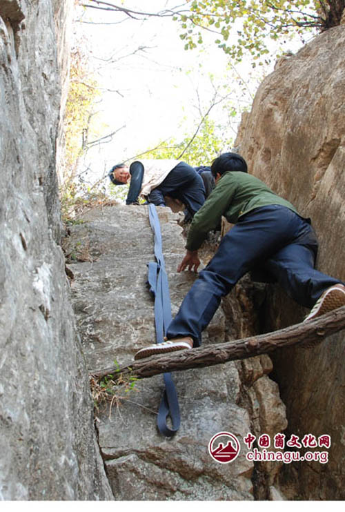 大家一路经过笊篱坪、十字涧、岱崮、先头峪四个行政村,沿着北岱崮西面的崮坡来到登崮现场,在唯一的登崮之门下,举目向上仰望,不禁令人望而生畏!所谓的山门,只不过是在陡直的崖壁上形成的一条宽不过两米,高度近20米的天然凹处,凹处的裸岩上零星分布着几个战争年代雕凿的深浅不一,没有规则的石窝,算是人工遗留的登崮辅助。大家稍作休整,由崮文化研究会年轻会员李强首先徒手登顶,将绳索固定到崖壁之上的树木上。然后,在大家相扶相携下,李存修紧紧抓牢从崖壁上垂下的绳索,由上面的会员负责接应和绳索的安全,下面的会员负责必要时的托举和帮忙寻找合适的落脚踩点,在大家的相互帮助和鼓励下,经过20分钟的艰苦努力,李存修终于成功攀上了向往已久的崮顶。当笔者问他爬上崮顶什么感受时,李存修说,他攀登过世界上许许多多的名山大川,那些山基本上都有台阶和一些辅助设施通达山顶,而像北岱崮这样的山,没有任何可抓的东西,就单靠一根悬着的绳索徒手攀越,对他来说还是头一回,这才是一次真正意义上的探险。(丁军国 摄影报道)