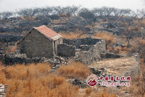 崮顶上,到处都是残垣断壁,石头墙基连绵不断。这无疑就是旧社会老百姓为躲避匪患而在山顶居住的古寨遗迹了。想那苦难的历史时期,政治黑暗、官贪吏夺、匪患蜂起、民不聊生,乡民在自己的田园无法正常生存,只好举家上山,躲避灾难。于是在今天的大多数沂蒙崮顶上就留下了这些永远诉说苦难的历史产物——崮顶山寨遗址。