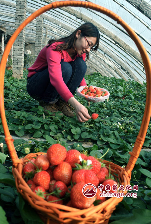 崮文化网讯 3月2日,游客在蒙阴县联城镇崔家城子村大棚里采摘草莓。红艳艳的果实,在绿叶的映衬下,显得格外诱人。