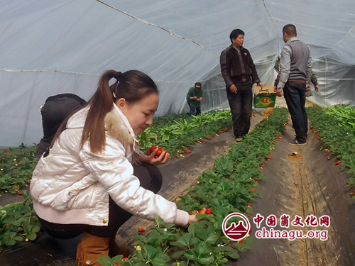 的采摘客。图为游客在采摘成熟的草莓。(王蕾)
