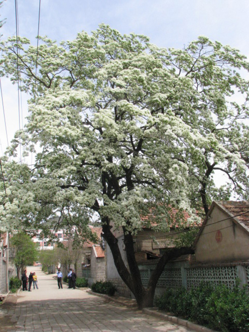 崮文化网讯 时下,在位于坦埠镇的蒙阴二中校内一棵流苏树开满了鲜花,远远望去,满树白花,如覆霜盖雪,清丽宜人,该流苏树已经100多年,相传为姓公的一家地主在自家后花园里载植用来观赏用的。流苏树不仅是名贵的观赏价值,而且全身是宝,芽有药用价值。嫩叶可代茶叶作饮料。果实含油丰富,可榨油,供工业用。木材坚重细致,可制作器具。此流苏树每年初夏盛开时节,常常引来周边居民前来观赏。(王振)