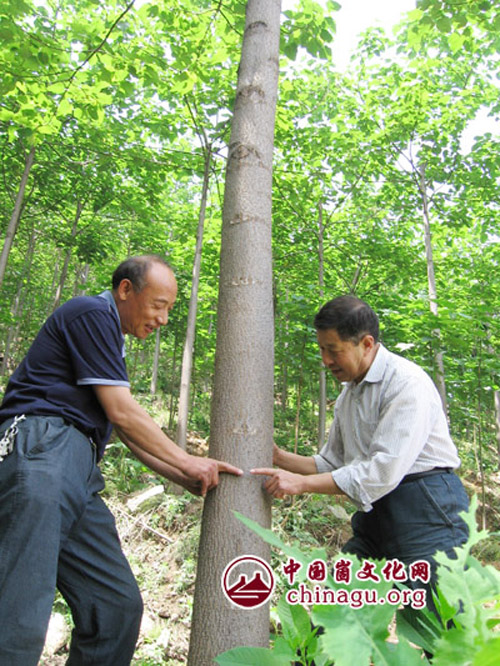 崮文化网讯 在沂蒙崮乡,由于长期栽植杨树,重茬循环,致使杨树疫病(病虫为害)严重,经济效益不高。为此,蒙阴县科协积极探讨利用梧桐代替杨树,取得明显成效。梧桐生长快、病虫害轻、抗旱、适应性强,一般5年就能成材,经济效益可观。图为县科协推广研究员薛军(右)和技术人员在荒山上查看栽植3年的梧桐长势。(宋国栋薛甜 秦金龙 )