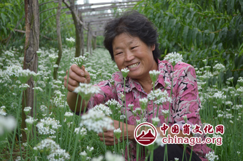近年来,这个镇积极调整农业种植结构,在常路社区和岭南头村建立了2000亩的无公害韭菜生产基地。在管理中,引到农民严格按照蔬菜无公害生产标准,杜绝使用高毒高残留农药,追施农家肥,所生产的韭菜香、鲜、味美,韭菜花香脆、鲜嫩、爽口,深受消费者的喜爱。目前这个镇的农民通过种植韭菜,每亩收入可达7000多元,韭菜已成为农民收入的主要来源。图为9月17日,该镇常路社区菜农吴秀莲在采摘韭花 。(张纪增