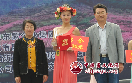 蒙阴县人大常委会副主任刁传梅、蒙阴县人民医院院长马禄兴为桃花仙子聂莹颁奖
